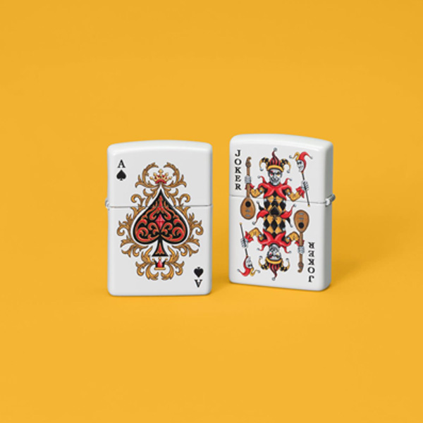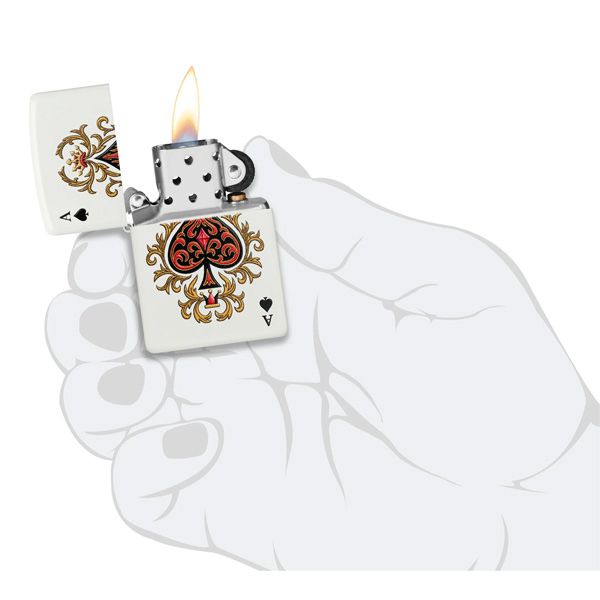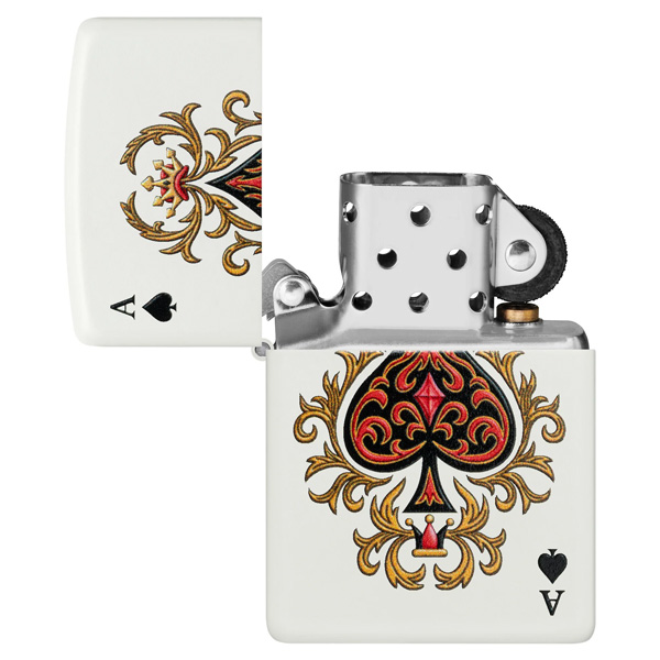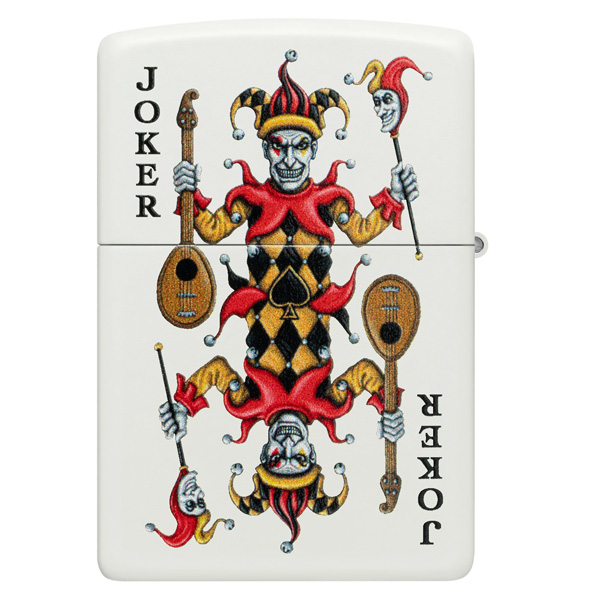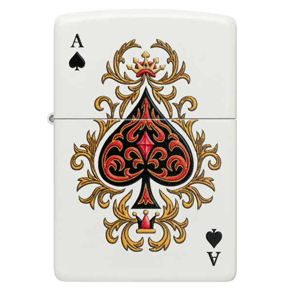 Tienes un as en la manga y un comodín con este clásico encendedor blanco mate. Un intrincado as de picas adorna la superficie frontal, mientras que un amenazante Joker se cierne sobre la parte trasera con diseños de imágenes a color de doble cara. Viene en una caja de regalo. Para un rendimiento óptimo, llénalo con combustible para encendedores Zippo.