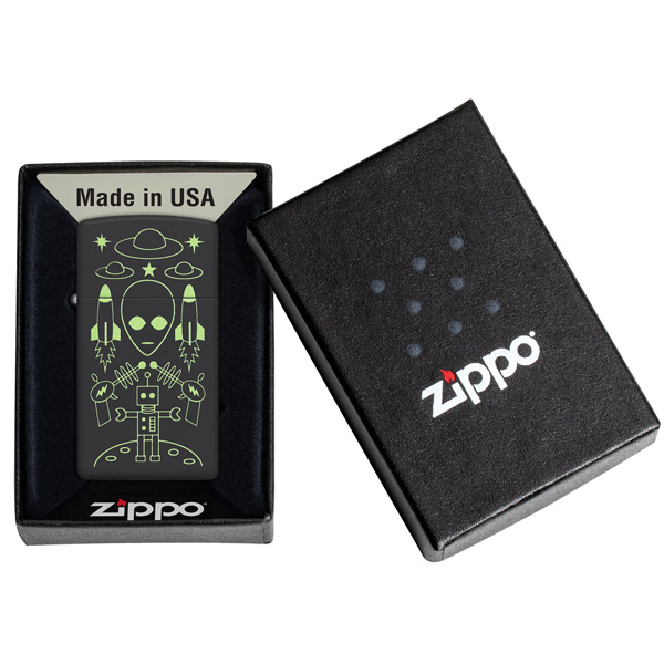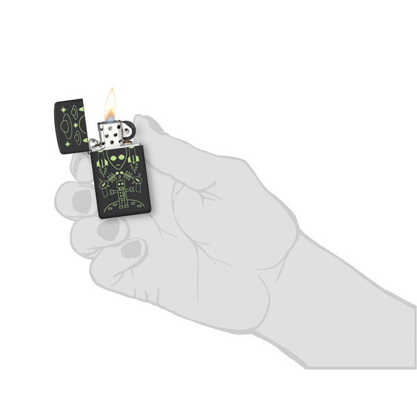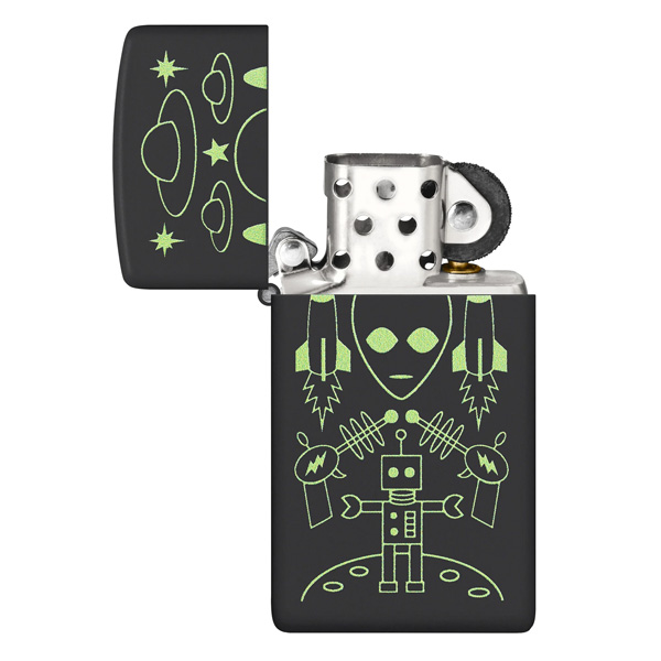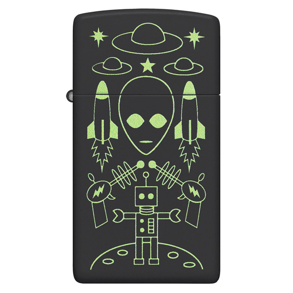 ¡Este encendedor Slim ® Negro Mate trae paz! Una ráfaga de platillos voladores, cohetes y pistolas de rayos rodea una cabeza alienígena flotante y un robot explorador lunar con el extravagante diseño Color Image. Viene en una caja de regalo. Para un rendimiento óptimo, llénelo con combustible para encendedores Zippo.
