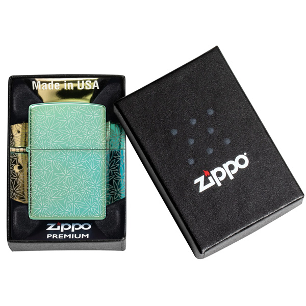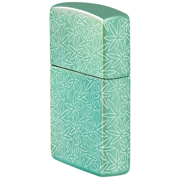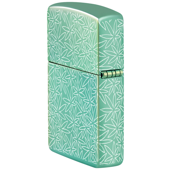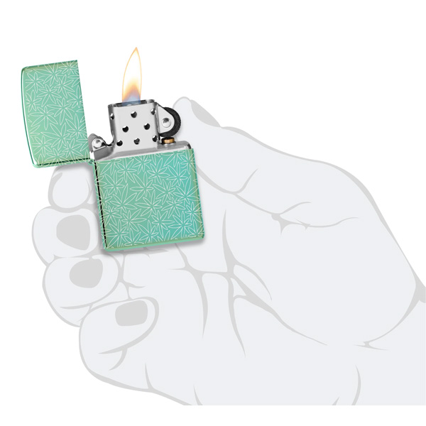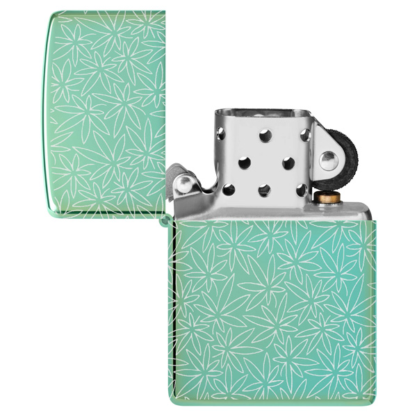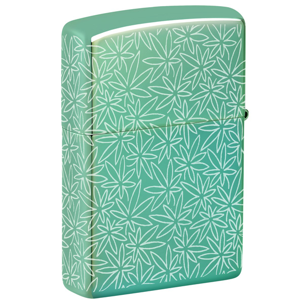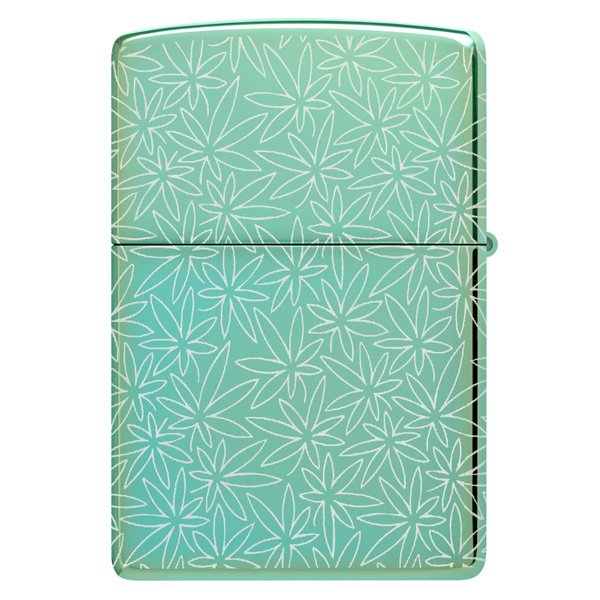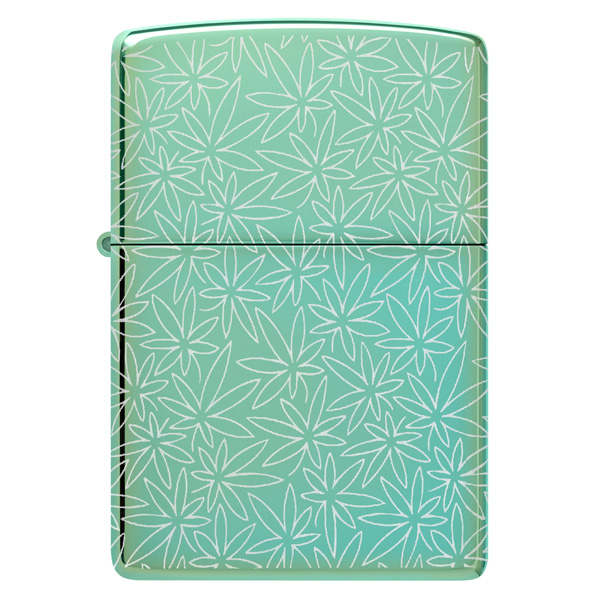 Un intrincado motivo de hojas de cannabis cubre cada superficie de este clásico encendedor verde de alto brillo, con un diseño Photo Image 360° inspirado en mediados de siglo. Viene en una caja de regalo. Para un rendimiento óptimo, rellénelo con gasolina para encendedores Zippo.