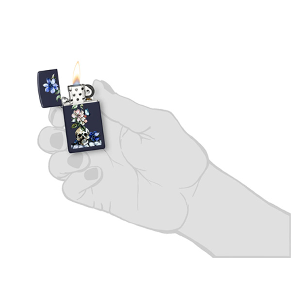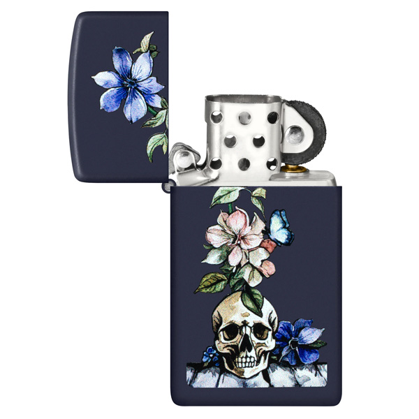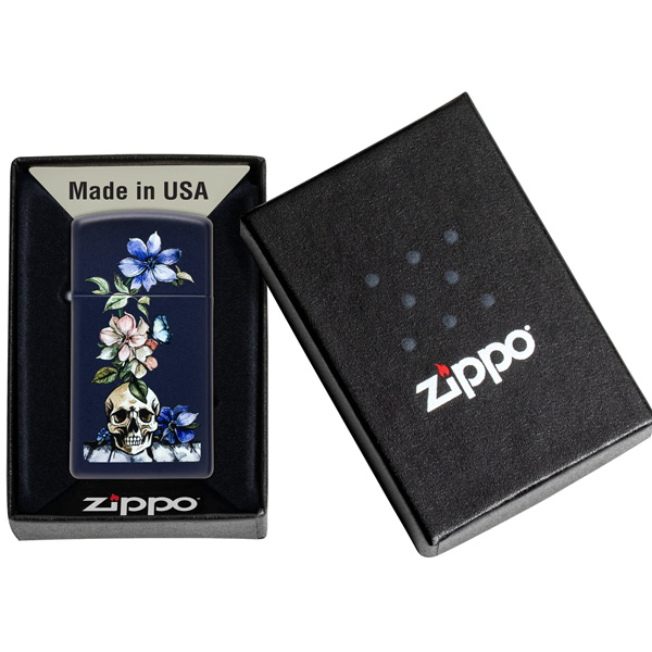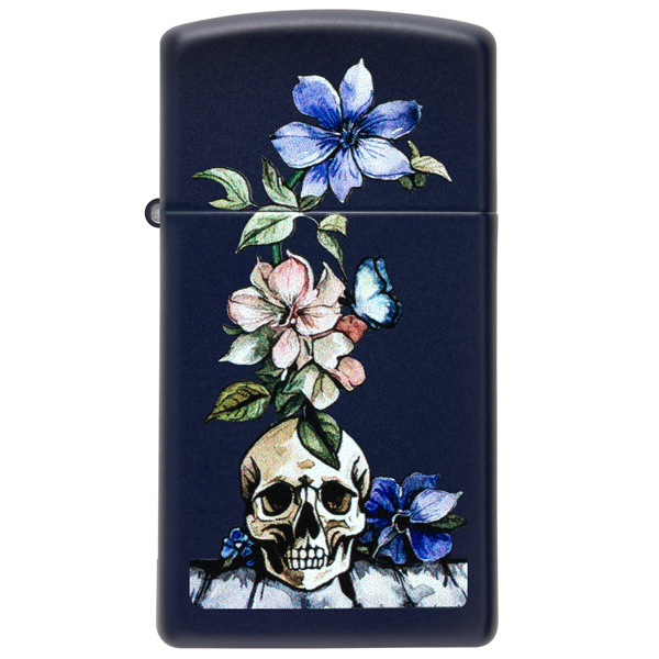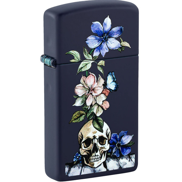Una calavera sonriente ancla un topiario de flores vibrantes en este Slim Encendedor azul marino mate con un delicado diseño de imagen a color. Viene en una caja de regalo. Para un rendimiento óptimo, llénelo con gasolina para encendedores Zippo.