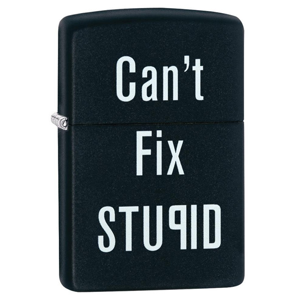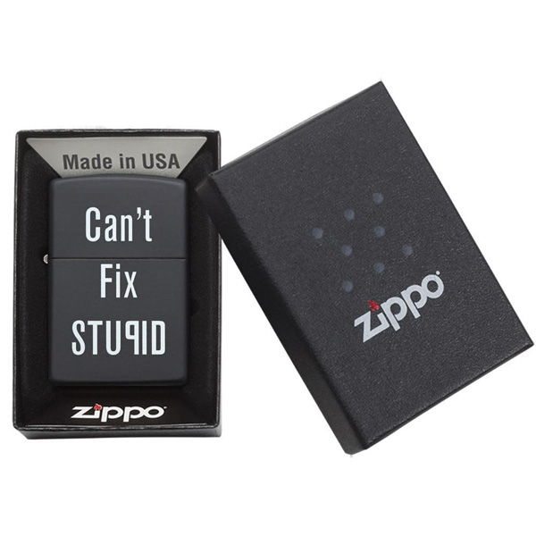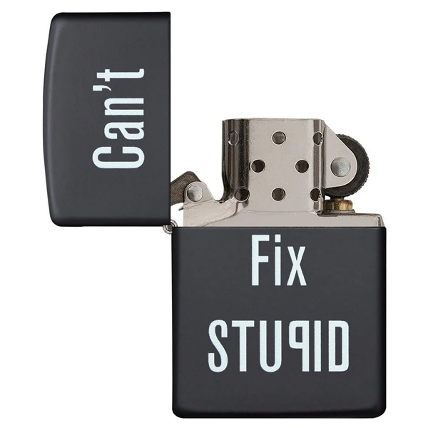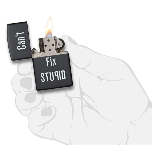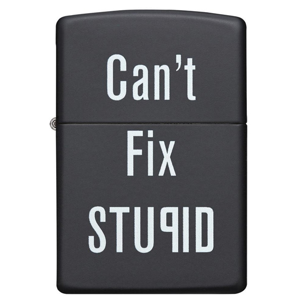 Ríete con este encendedor negro mate a prueba de viento “Can’t fix stupid”. Viene en una caja de regalo. Para un rendimiento óptimo, llénalo con gasolina para encendedores Zippo.