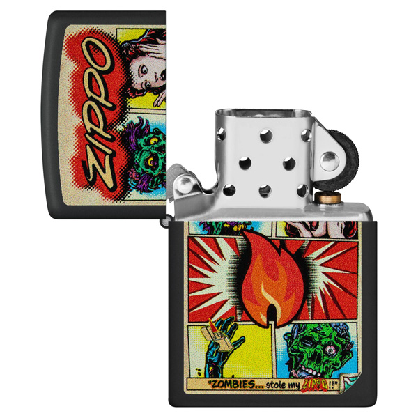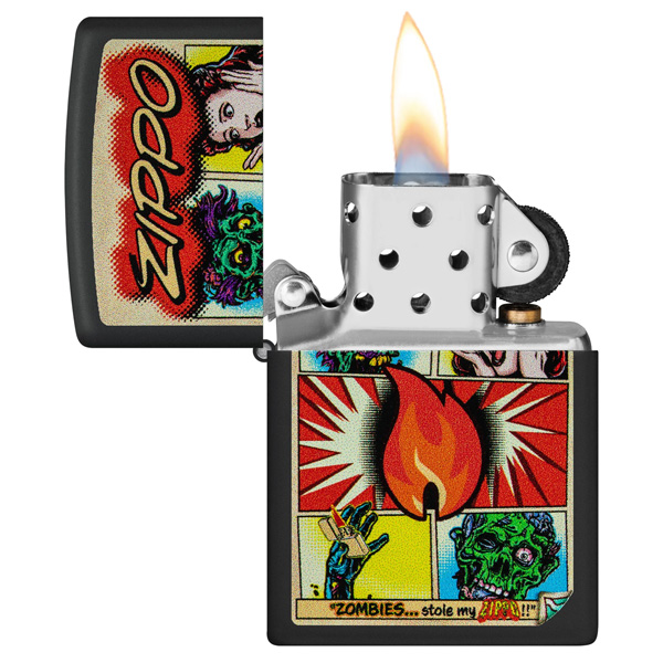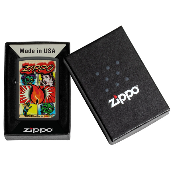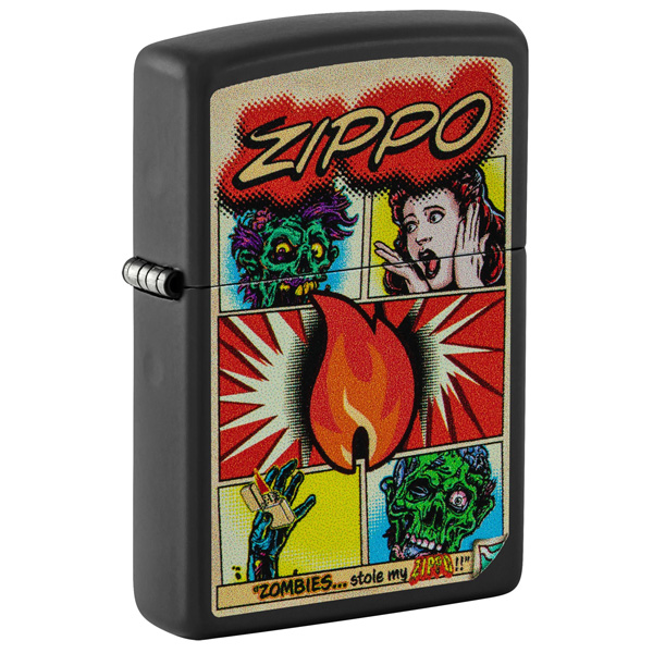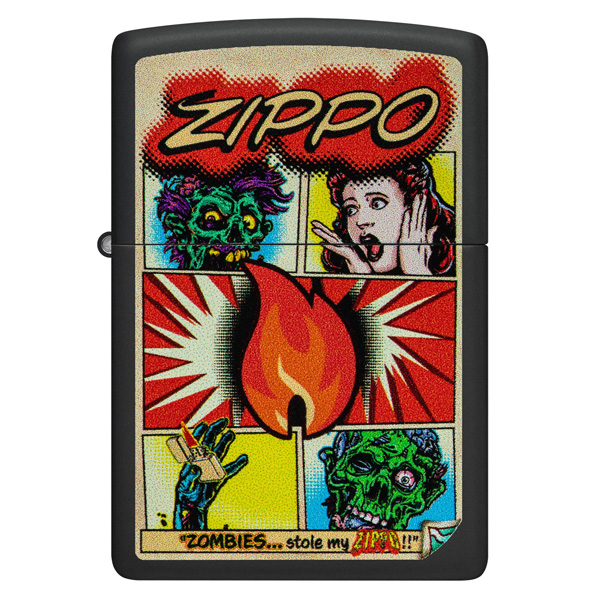 No dejes que los zombis te roben este clásico encendedor negro mate. Con reminiscencias de una novela gráfica clásica, la impactante y aterradora historia cobra vida en un audaz diseño de imagen a color. Viene en una caja de regalo. Para un rendimiento óptimo, llénalo con gasolina para encendedores Zippo.