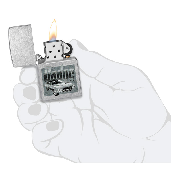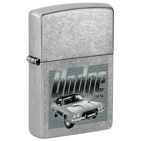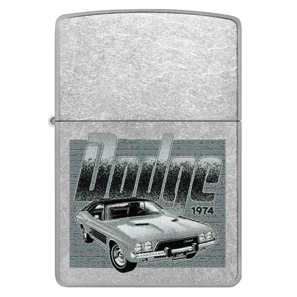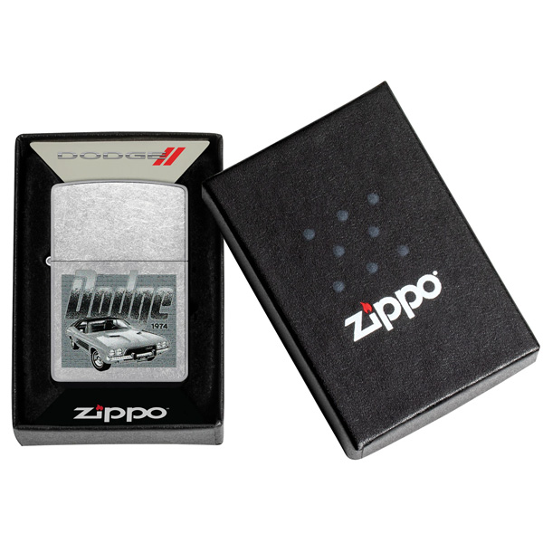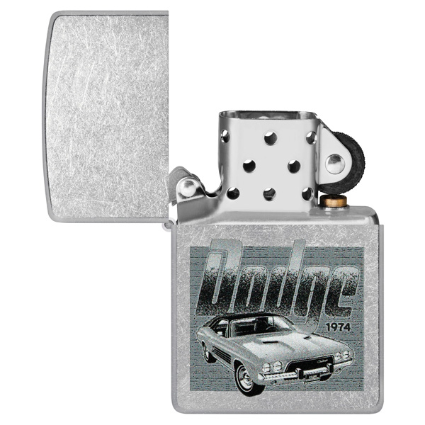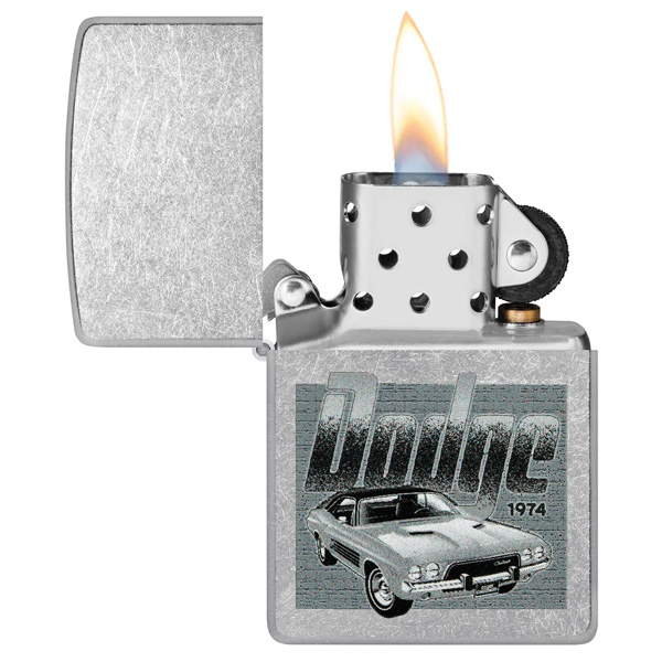 Un Challenger vintage domina la superficie de este encendedor clásico Street Chrome bajo el logotipo vintage de Dodge en un diseño monocromático Color Image. Viene en una caja de regalo. Para un rendimiento óptimo, rellénelo con gasolina para encendedores Zippo.