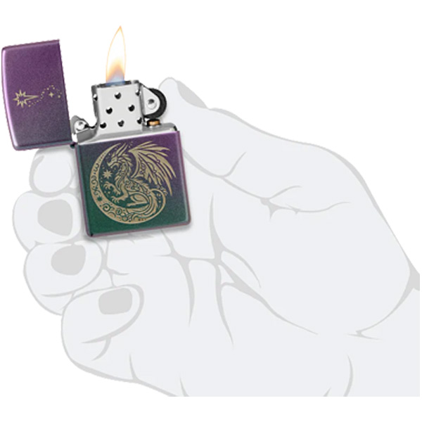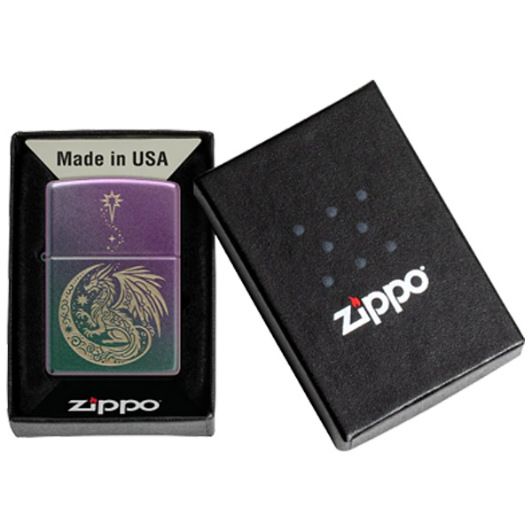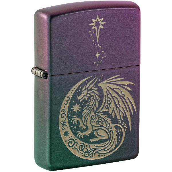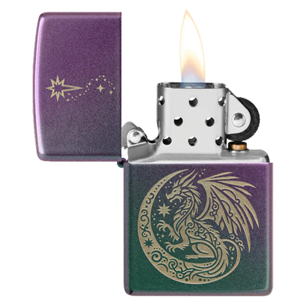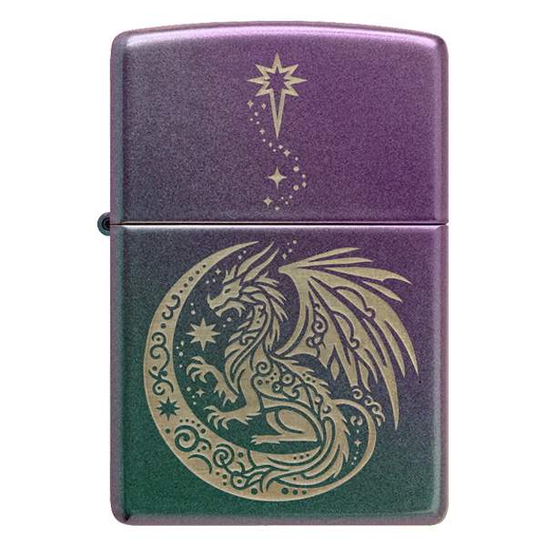 Encaramado entre las estrellas de una brillante luna creciente, un imponente dragón adorna este clásico encendedor iridiscente con un sereno diseño grabado a láser. Viene en una caja de regalo. Para un rendimiento óptimo, llénelo con gasolina para encendedores Zippo.