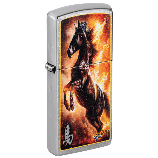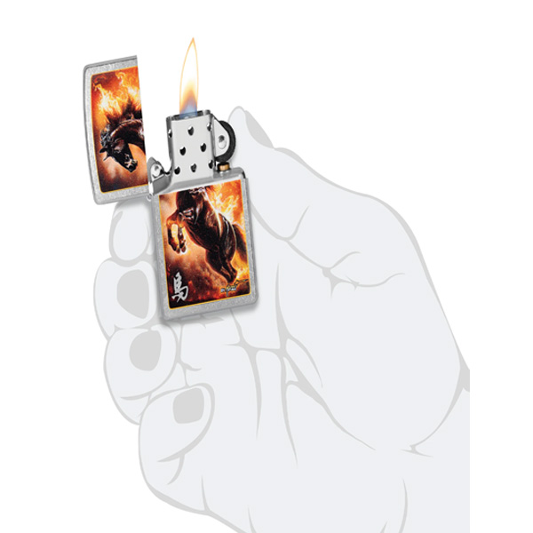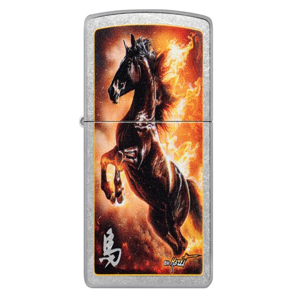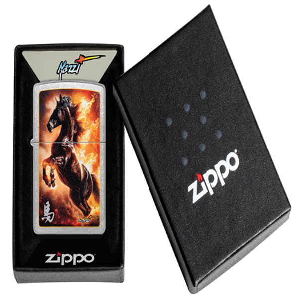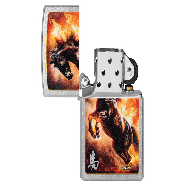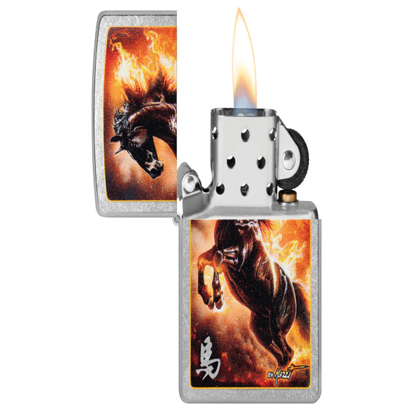 El estilo onírico del maestro aerógrafo Claudio Mazzi cobra protagonismo en este clásico encendedor Street Chrome. Rodeado de llamas feroces, un semental salvaje salta sobre la superficie en un ardiente diseño de Color Image. Viene en una caja de regalo. Para un rendimiento óptimo, rellénelo con gasolina para encendedores Zippo.