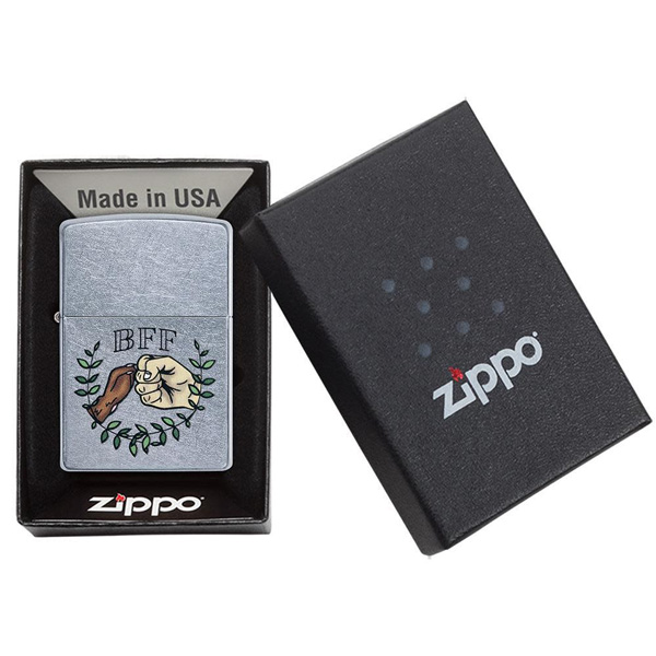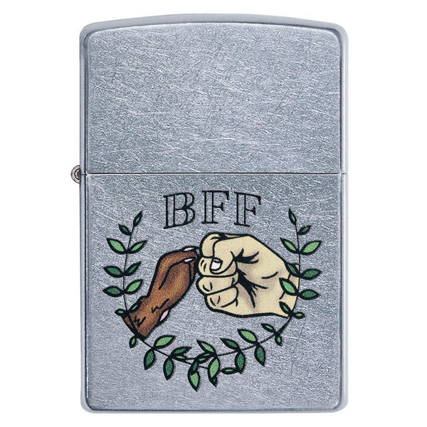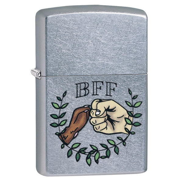 Celebra la amistad con tu mejor amigo peludo con este encendedor Street Chrome™. Su diseño muestra a un hombre y un perro chocando los cinco, rodeados por una corona de laurel. Gracias a sus imágenes a color, esta pieza captura a la perfección el vínculo entre el mejor amigo del hombre y su dueño. Viene en una caja de regalo. Para un rendimiento óptimo, utiliza combustible para encendedores Zippo.