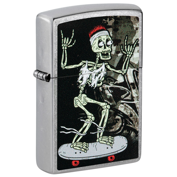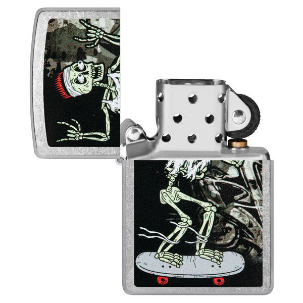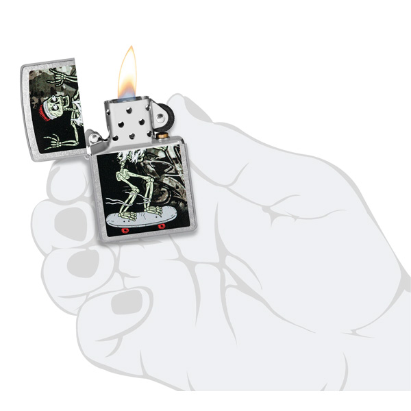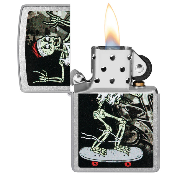 El skate es la vida… y mucho más. Un esqueleto retorcido patina sobre la superficie de este clásico encendedor Street Chrome con un divertido diseño de imagen a color. Viene en una caja de regalo. Para un rendimiento óptimo, llénelo con gasolina para encendedores Zippo.
