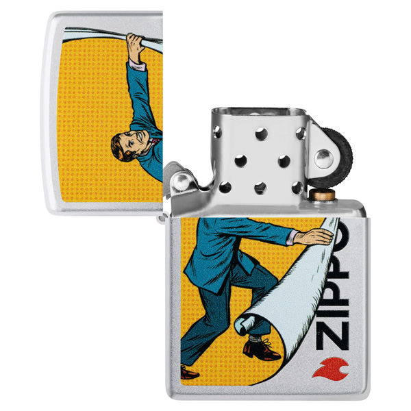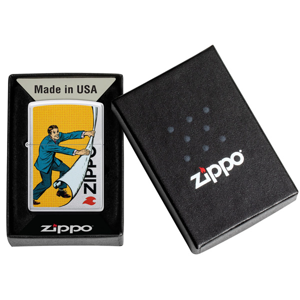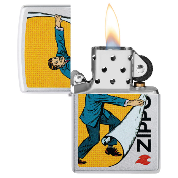 Representado en un divertido arte pop pixelado, un elegante personaje descorre una cortina para revelar el logotipo de Zippo en este clásico encendedor de cromo satinado con un diseño de imagen a color inspirado en los cómics. Viene en una caja de regalo. Para un rendimiento óptimo, rellénelo con gasolina para encendedores Zippo.