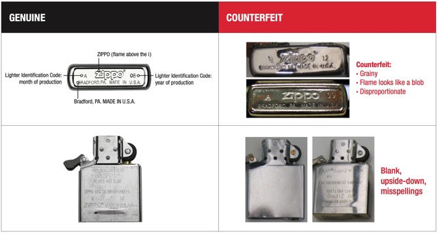 Estos registros, junto con otros derechos de propiedad intelectual de Zippo, significan que terceros tienen prohibido usar las marcas de Zippo en productos que no sean auténticos de Zippo. Es importante que nuestros clientes sepan identificar productos falsificados o infractores y comprendan el daño que pueden causar en el mercado.